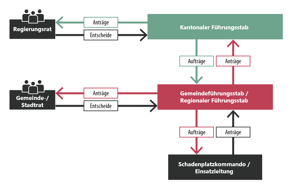 Die Luzerner Gemeinden sind verpflichtet, einen Chef oder eine Chefin Bevölkerungsschutz zu bestimmen und mit den Vorbereitungen für die Ereignisbewältigung zu beauftragen. Der KFS ist für die obligatorische Ausbildung dieser Personen verantwortlich und unterstützt sie im Ereignisfall. Die Gemeinden bauen ihren Gemeinde- bzw. regionalen Führungsstab (GFS/RFS) je nach Bedarf auf, wobei die Arbeit nach den Vorgaben des KFS organisiert wird, namentlich Organisation, Abläufe, Einrichtungen, Verbindungen und Aufgebot. Die GFS/RFS können durch das Justiz- und Sicherheitsdepartement, den Stabschef oder die Stabschefin des KFS, den Gemeinderat, die Chefin oder den Chef Bevölkerungsschutz der Gemeinden sowie die Einsatzleitung der Feuerwehr und der Polizei aufgeboten werden.