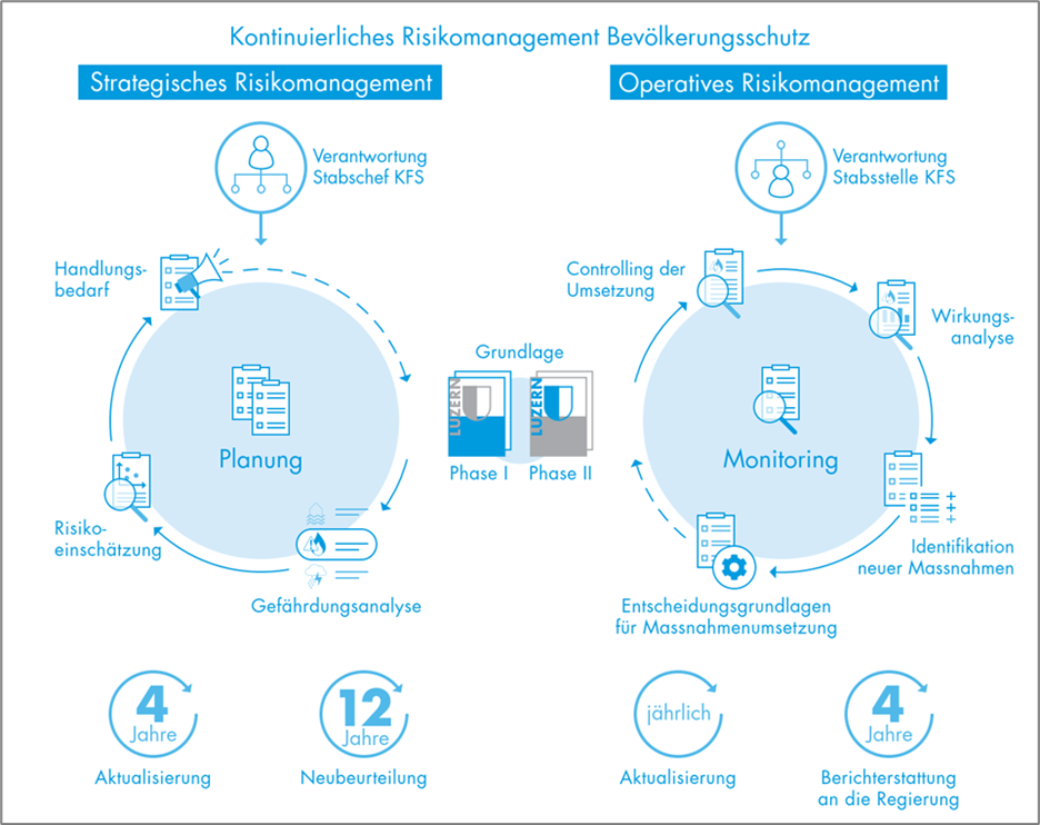 Die kantonale Verordnung über den Bevölkerungsschutz beauftragt den KFS mit der Erstellung einer Gefahren- und Risikoanalyse (KATAPLAN). Nach der erstmaligen Erarbeitung 2019 wurde und wird diese jährlich aktualisiert und alle vier Jahre strategisch überarbeitet. Dieses kontinuierliche Risikomanagement stützt sich fachlich und methodisch auf die Grundlagen des Bundesamtes für Bevölkerungsschutz (z.B. Leitfaden KATAPLAN und Gefährdungskatalog). Hauptbestandteil des Luzerner KATAPLANS bilden die Gefährdungsdossiers, welche die für den Kanton Luzern relevanten Bedrohungen und Risiken aufzeigen. Sie dienen als Basis für die risikobasierte Vorsorge-/Massnahmenplanung und ergänzen als stetige Grundlage die laufende Lagebeurteilung im Bevölkerungsschutz.